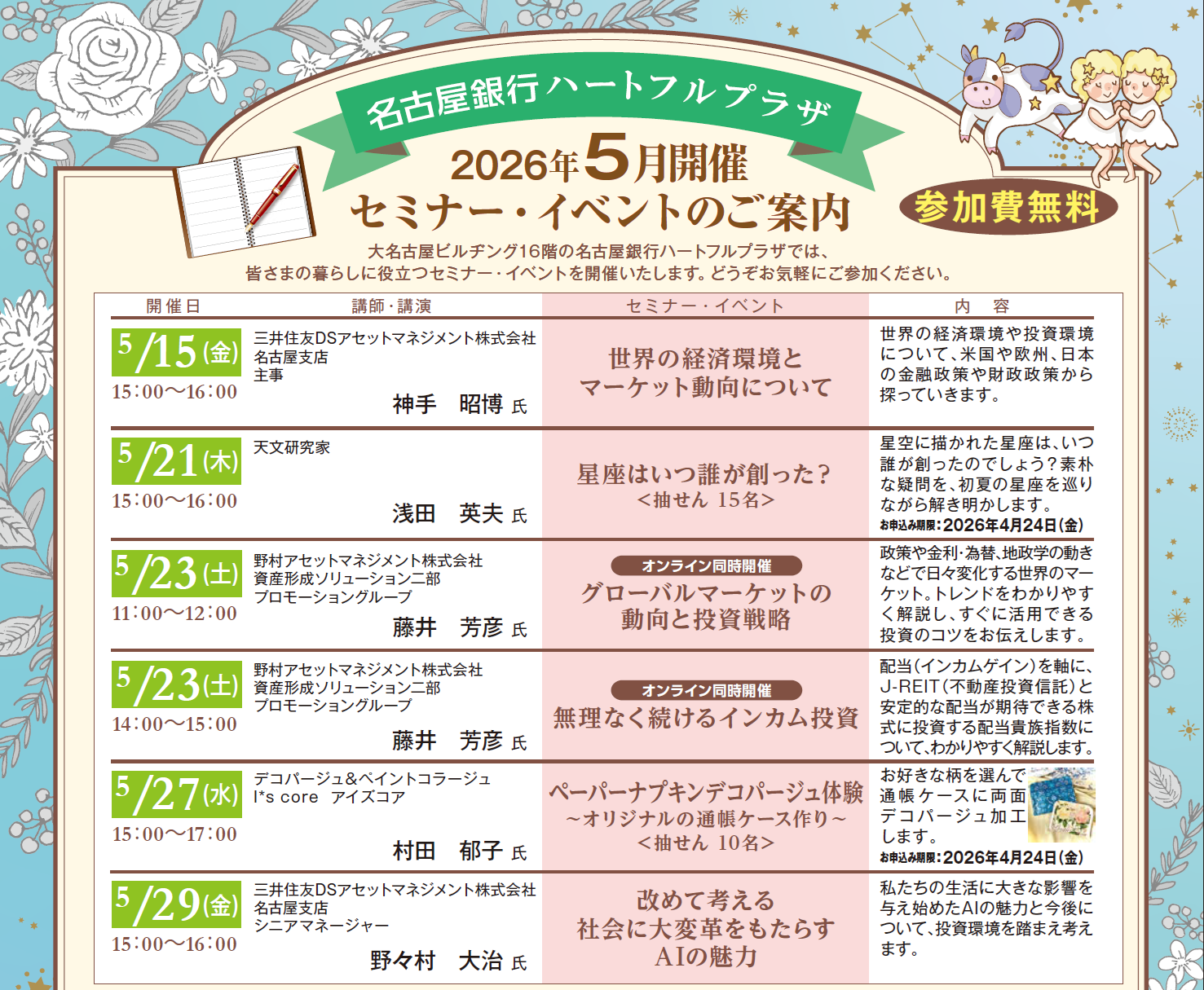 名古屋銀行主催のセミナーにおきましては、お客さまの目的やご投資の経験等に応じて、お客さまのニーズに即した個別商品のご案内および勧誘をさせていただくことがあります。ご案内を差し上げる商品の中には、所定の手数料をご負担いただく商品および価格の変動等により投資額を下回る(元本割れ)商品もあります。商品ごとの手数料およびリスクは異なりますので、お申込みに際しては当該商品の契約締結前交付書面等を十分にお読みください。また、詳しくは窓口へお問合せください。