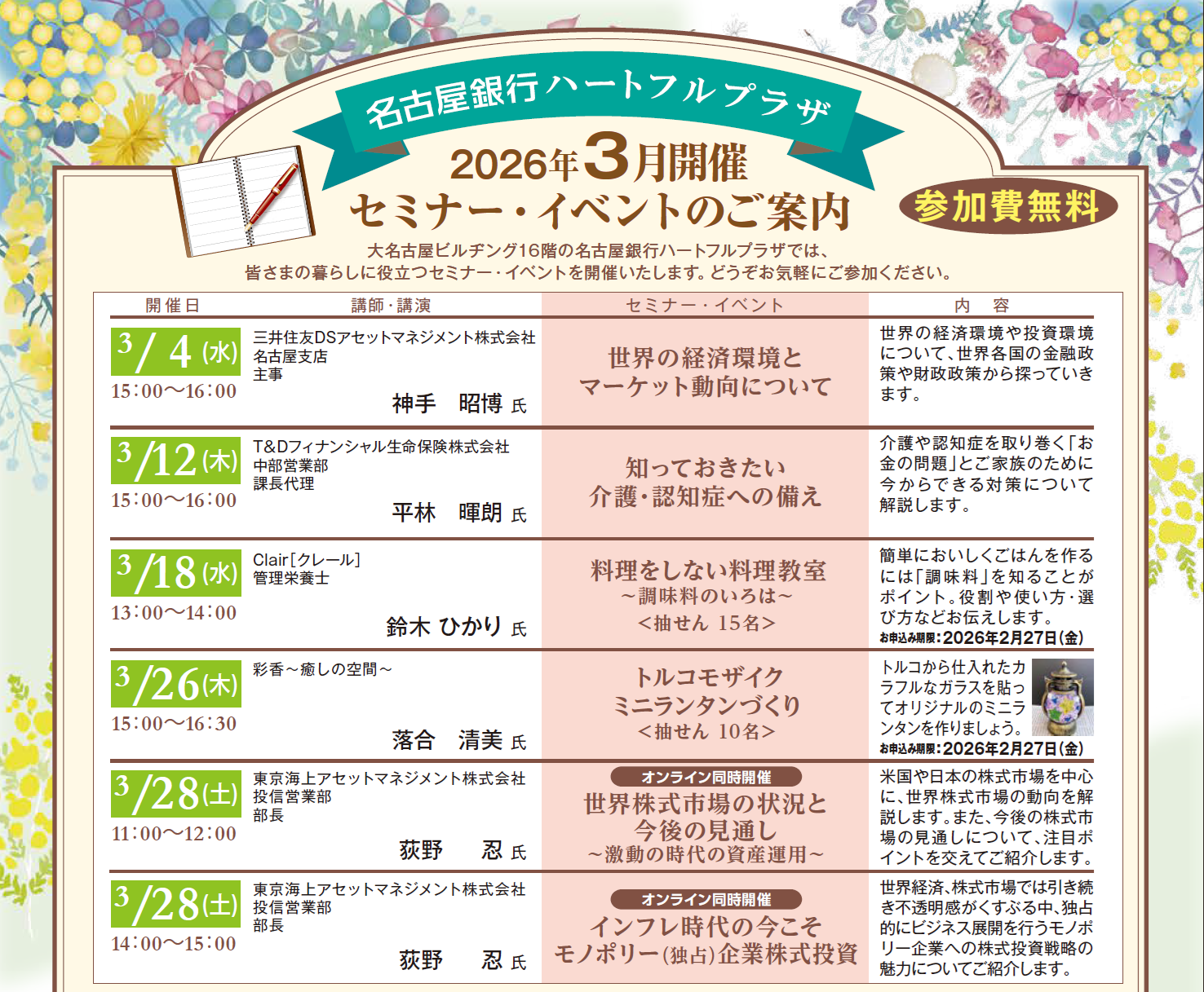 名古屋銀行主催のセミナーにおきましては、お客さまの目的やご投資の経験等に応じて、お客さまのニーズに即した個別商品のご案内および勧誘をさせていただくことがあります。ご案内を差し上げる商品の中には、所定の手数料をご負担いただく商品および価格の変動等により投資額を下回る(元本割れ)商品もあります。商品ごとの手数料およびリスクは異なりますので、お申込みに際しては当該商品の契約締結前交付書面等を十分にお読みください。また、詳しくは窓口へお問合せください。