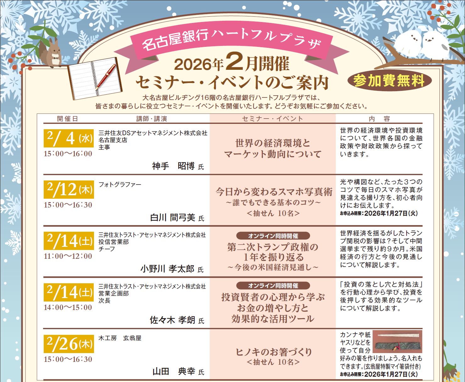 名古屋銀行主催のセミナーにおきましては、お客さまの目的やご投資の経験等に応じて、お客さまのニーズに即した個別商品のご案内および勧誘をさせていただくことがあります。ご案内を差し上げる商品の中には、所定の手数料をご負担いただく商品および価格の変動等により投資額を下回る(元本割れ)商品もあります。商品ごとの手数料およびリスクは異なりますので、お申込みに際しては当該商品の契約締結前交付書面等を十分にお読みください。また、詳しくは窓口へお問合せください。