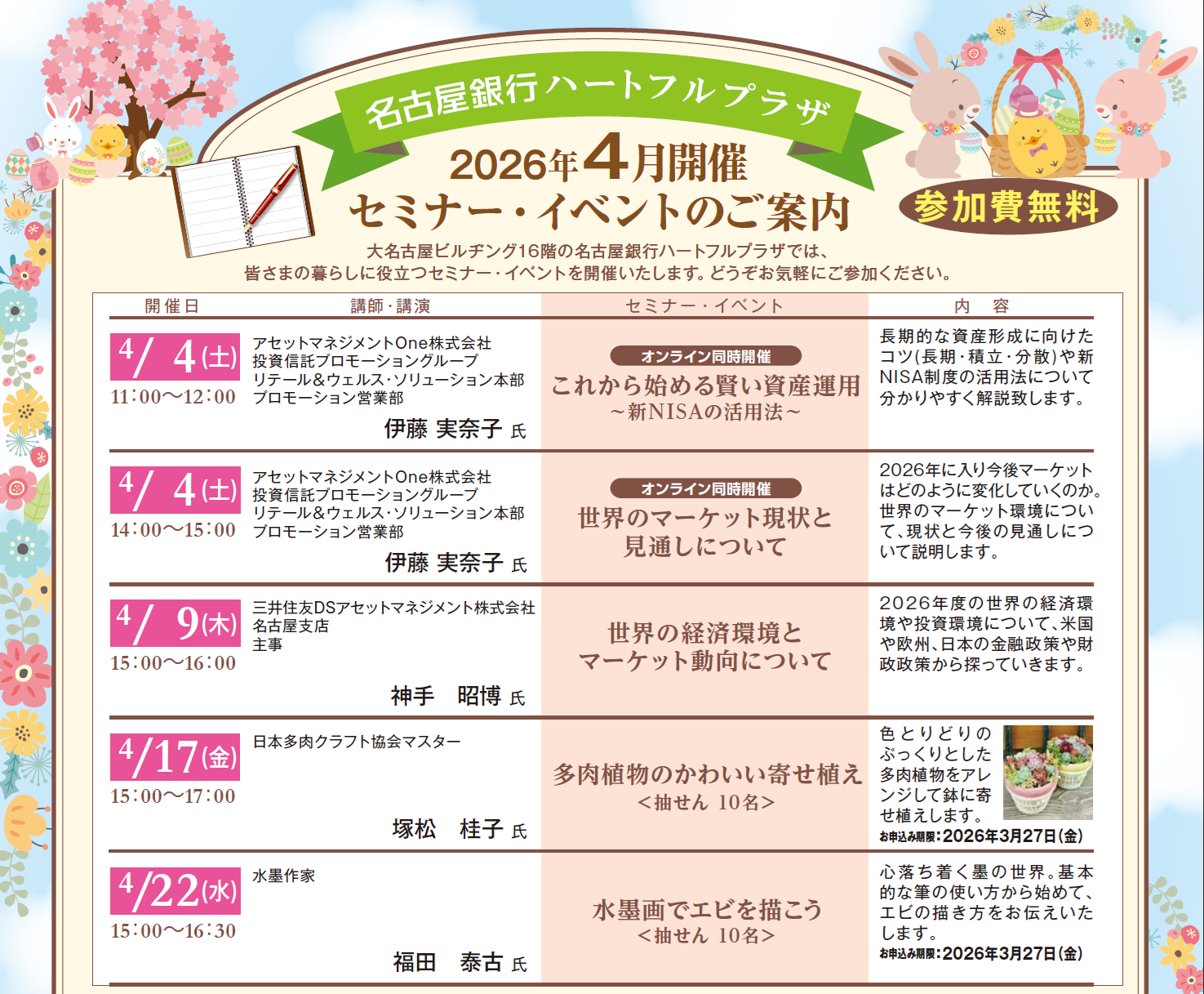 名古屋銀行主催のセミナーにおきましては、お客さまの目的やご投資の経験等に応じて、お客さまのニーズに即した個別商品のご案内および勧誘をさせていただくことがあります。ご案内を差し上げる商品の中には、所定の手数料をご負担いただく商品および価格の変動等により投資額を下回る(元本割れ)商品もあります。商品ごとの手数料およびリスクは異なりますので、お申込みに際しては当該商品の契約締結前交付書面等を十分にお読みください。また、詳しくは窓口へお問合せください。