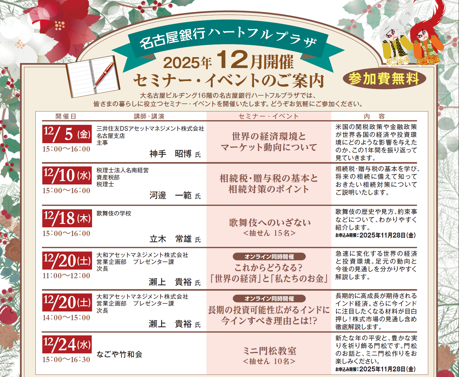 名古屋銀行主催のセミナーにおきましては、お客さまの目的やご投資の経験等に応じて、お客さまのニーズに即した個別商品のご案内および勧誘をさせていただくことがあります。ご案内を差し上げる商品の中には、所定の手数料をご負担いただく商品および価格の変動等により投資額を下回る(元本割れ)商品もあります。商品ごとの手数料およびリスクは異なりますので、お申込みに際しては当該商品の契約締結前交付書面等を十分にお読みください。また、詳しくは窓口へお問合せください。